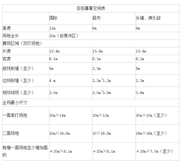 按行业比赛规定,整个球场上空空间 低为9米,在这个高度以内,不得有任何横梁或其它障碍物,球场四周2米以内不得有任何障碍物。任何并列的两个球场之间, 少应有2米的距离。球场四周的墙壁 好为深色,不能有风。