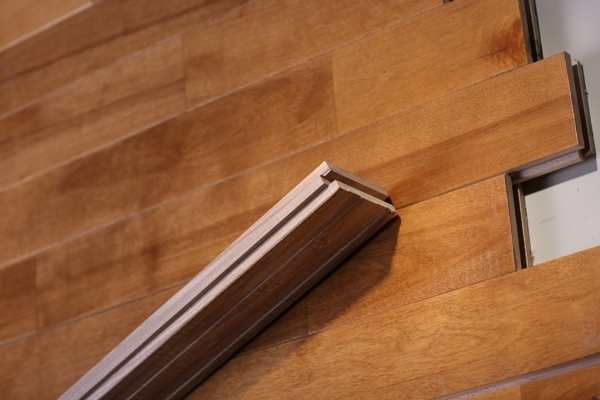 面板与上层龙骨呈90度垂直铺设,离墙20mm开始铺设面层地板。面层地板的固定采用电钻在下层企口处引眼后,用专用地板钉固定在毛地板上,每块地板之间不宜拼得太紧,以防止热胀冷缩变形,以此保证地板的牢固性、耐久性。